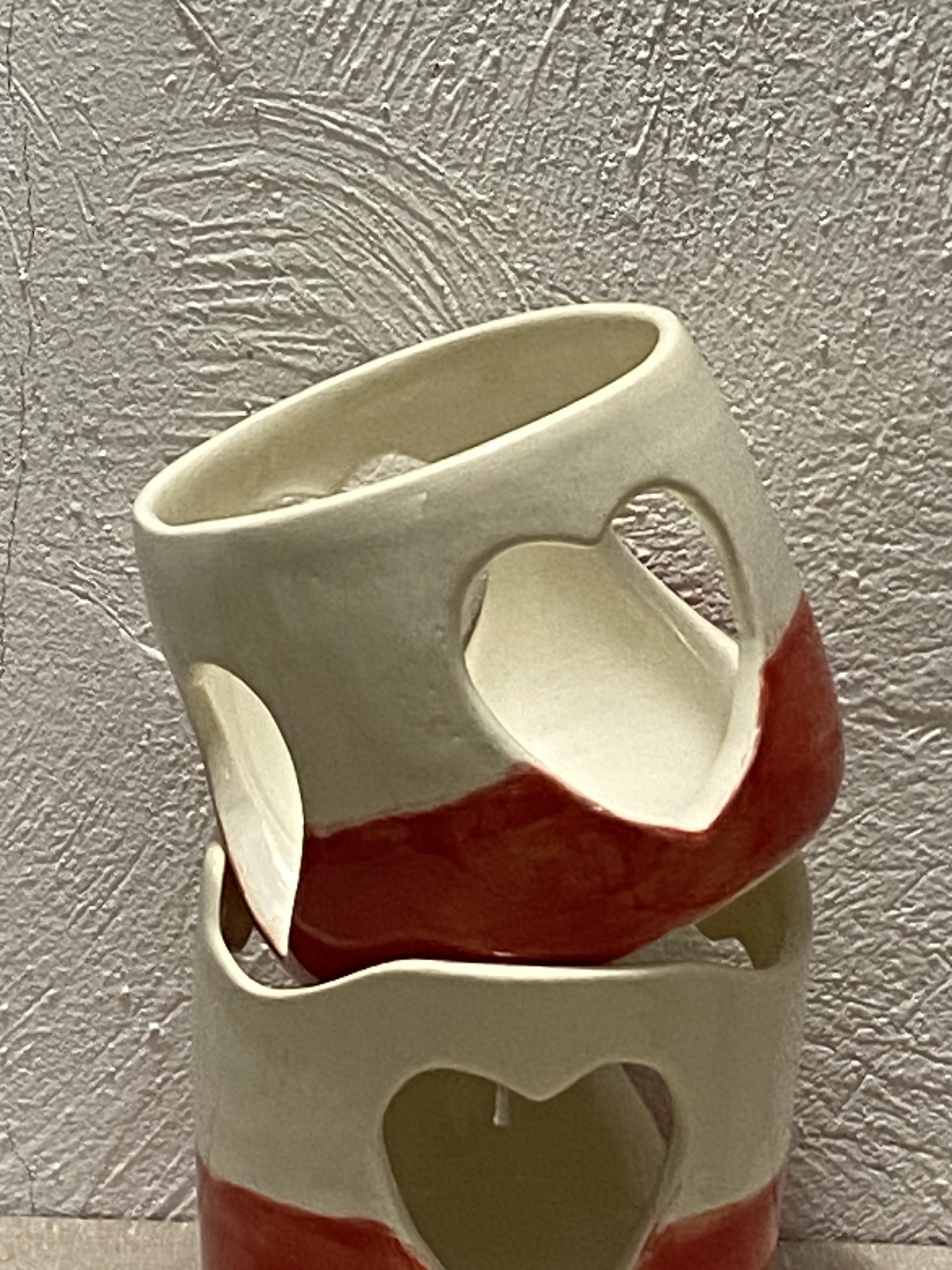 Photophore Coeur tourné en faïence blanche avec un émail rouge.