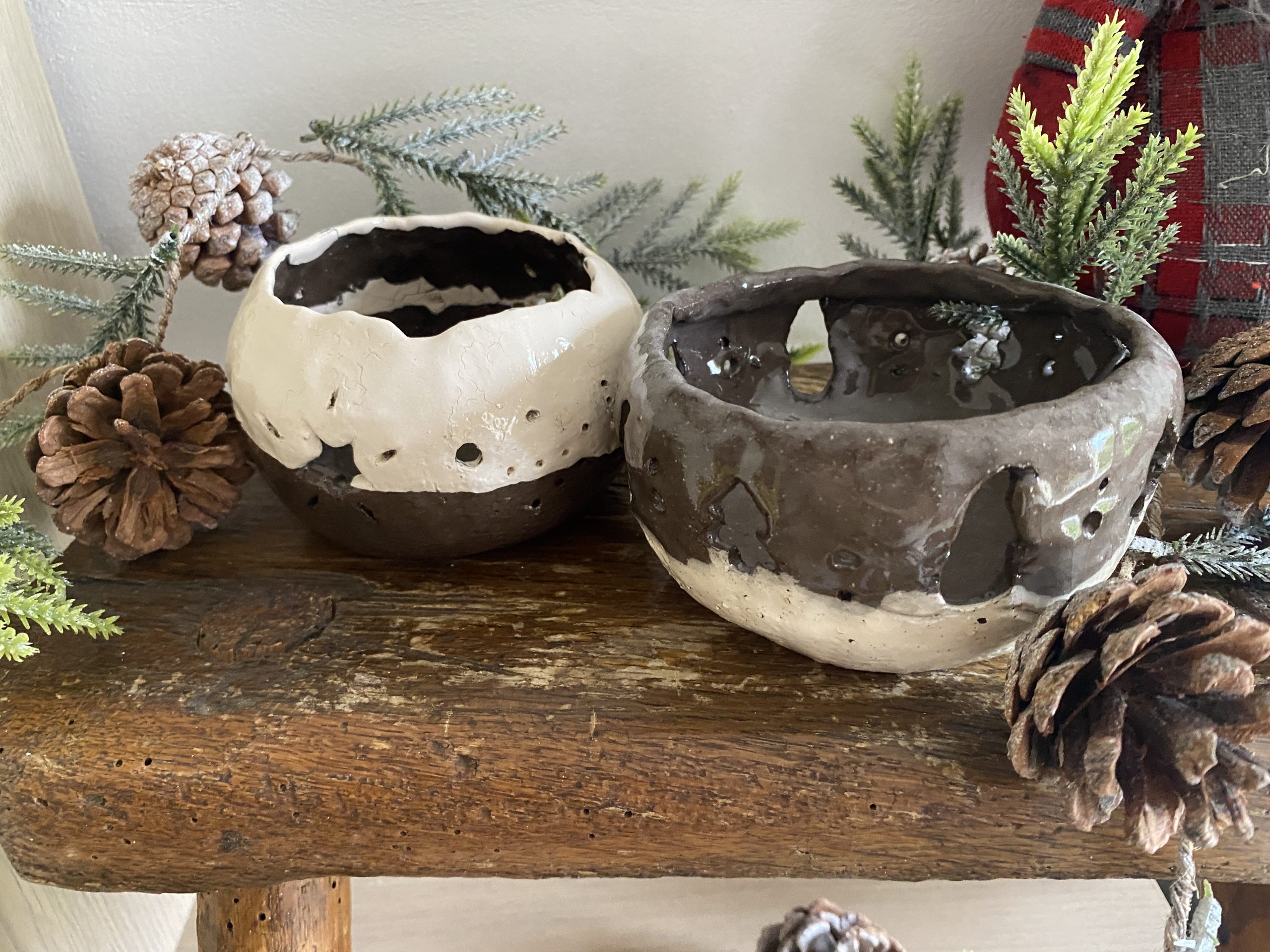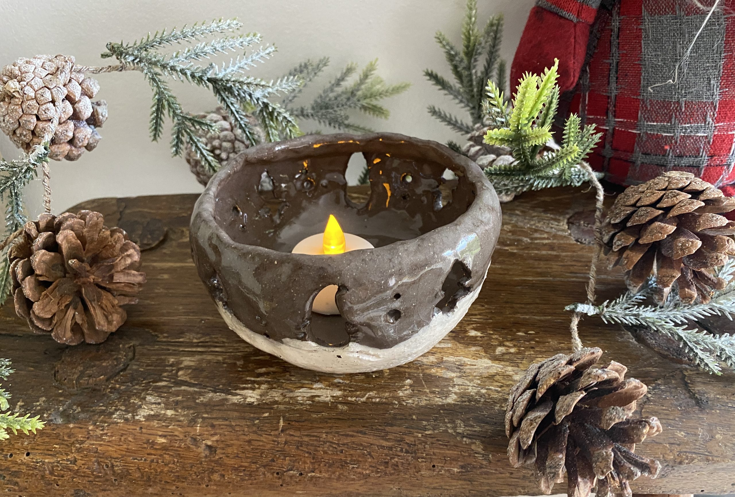 | Photophore Noël | Faïence noire avec engobe blanc et couverte transparente |
