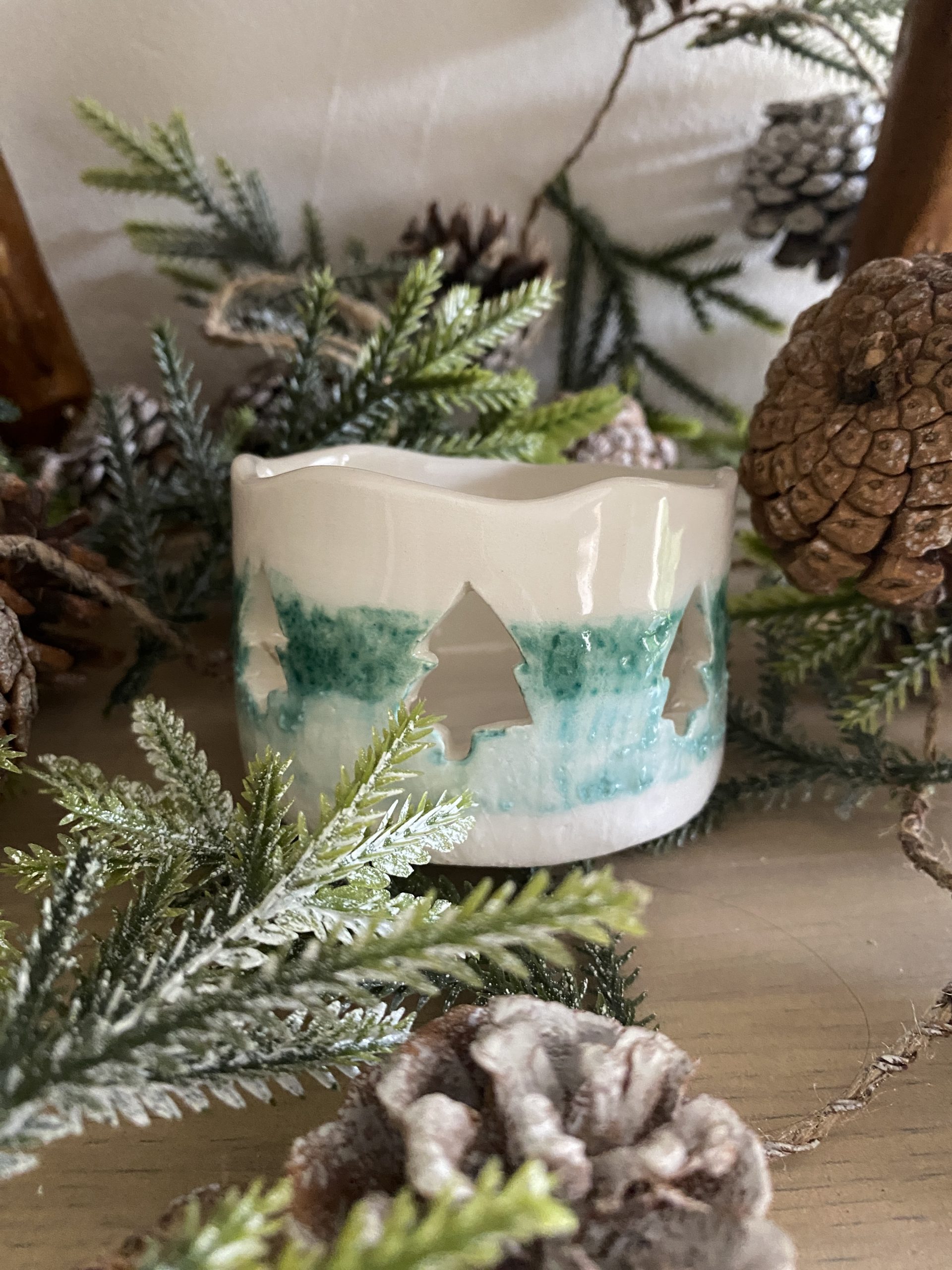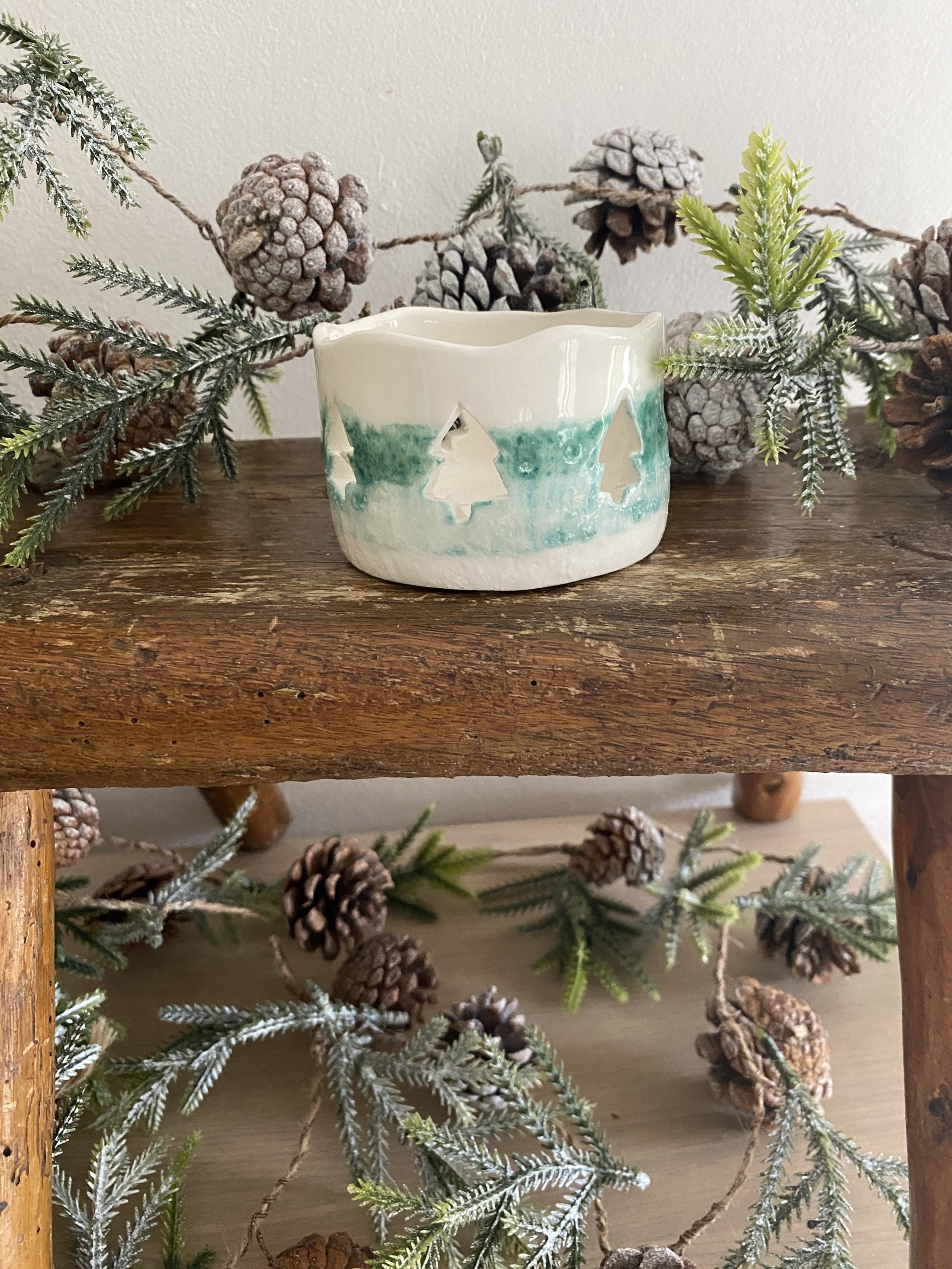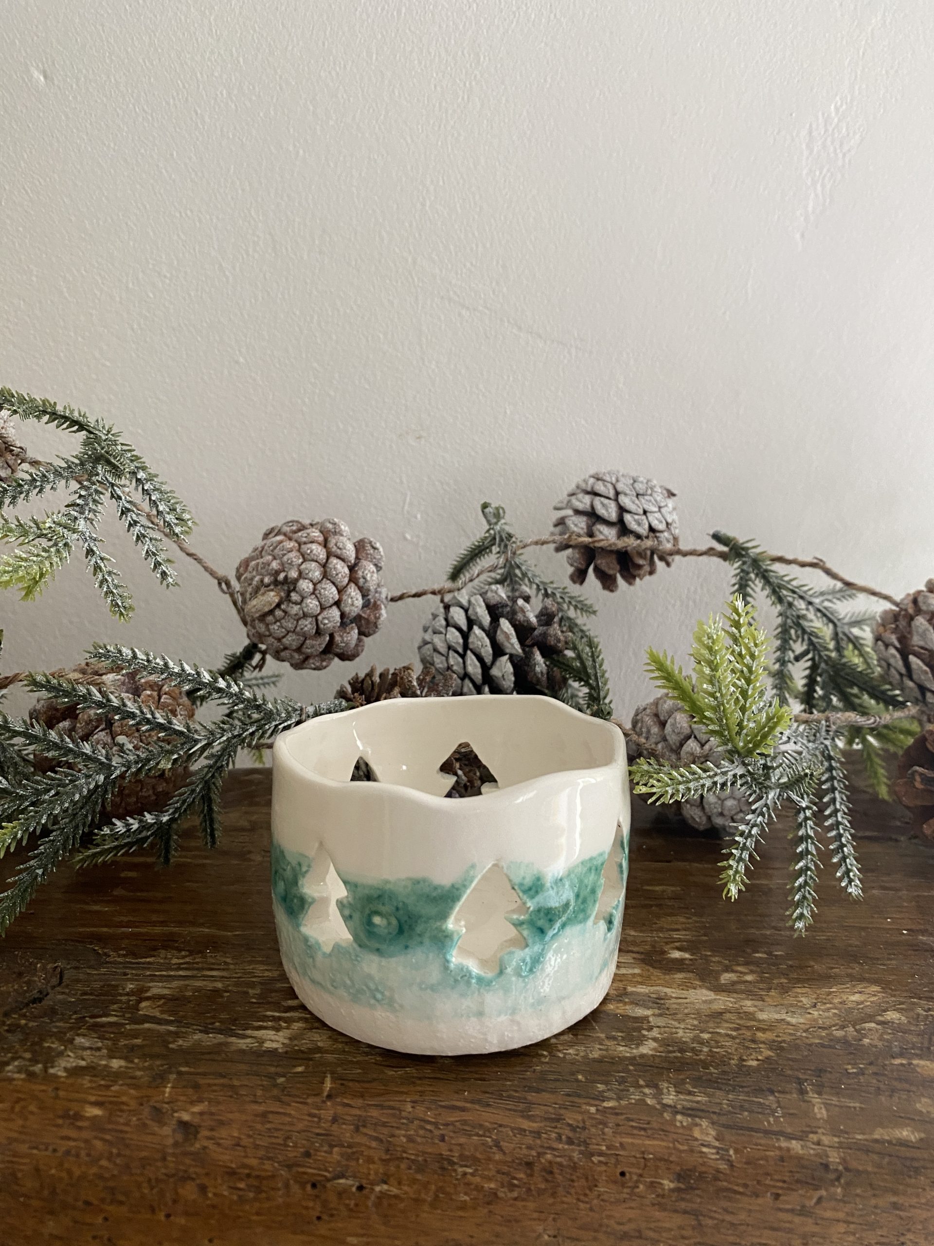 | Photophore Noël | Faïence blanche parsemée d'émail vert et d'engobe blanc |