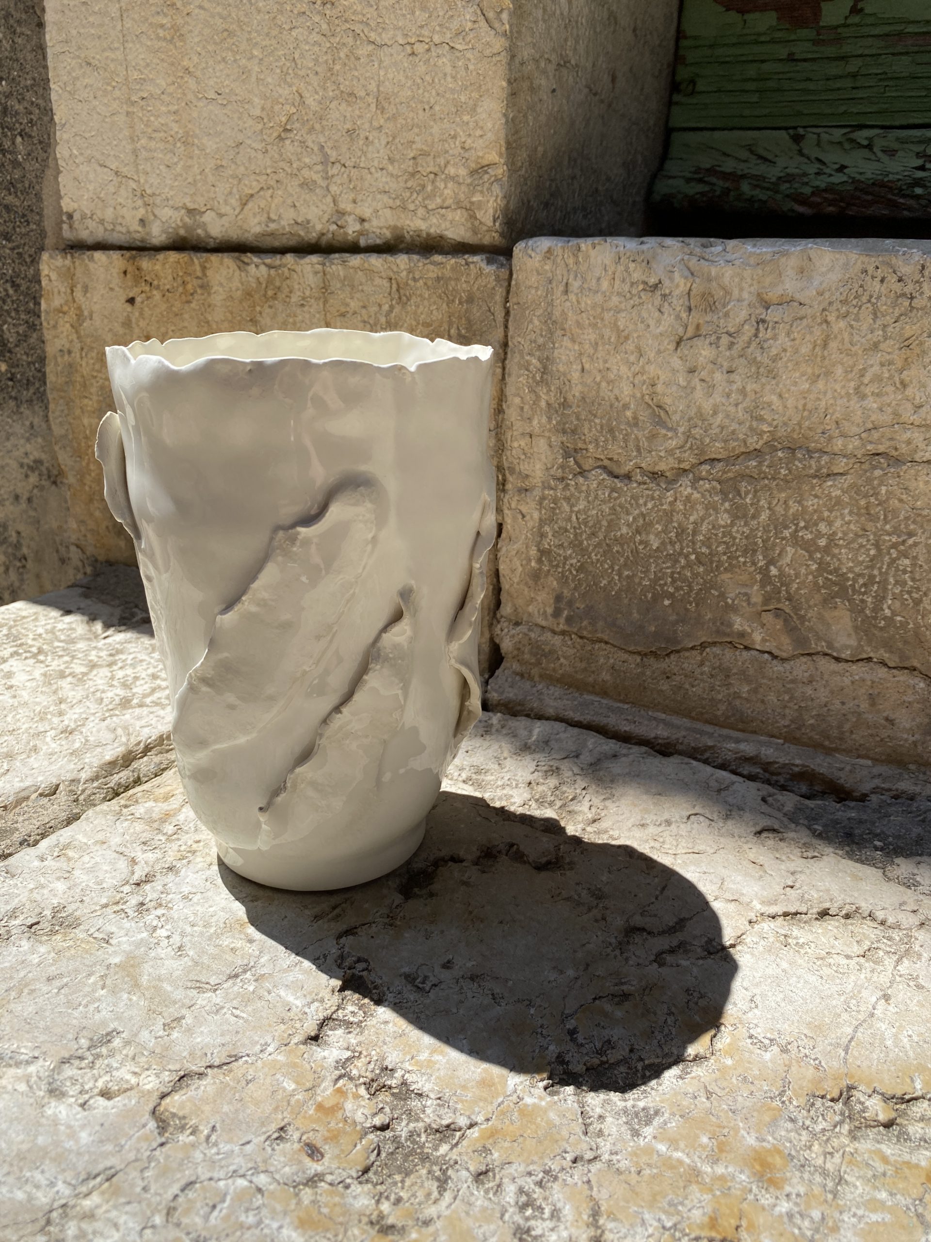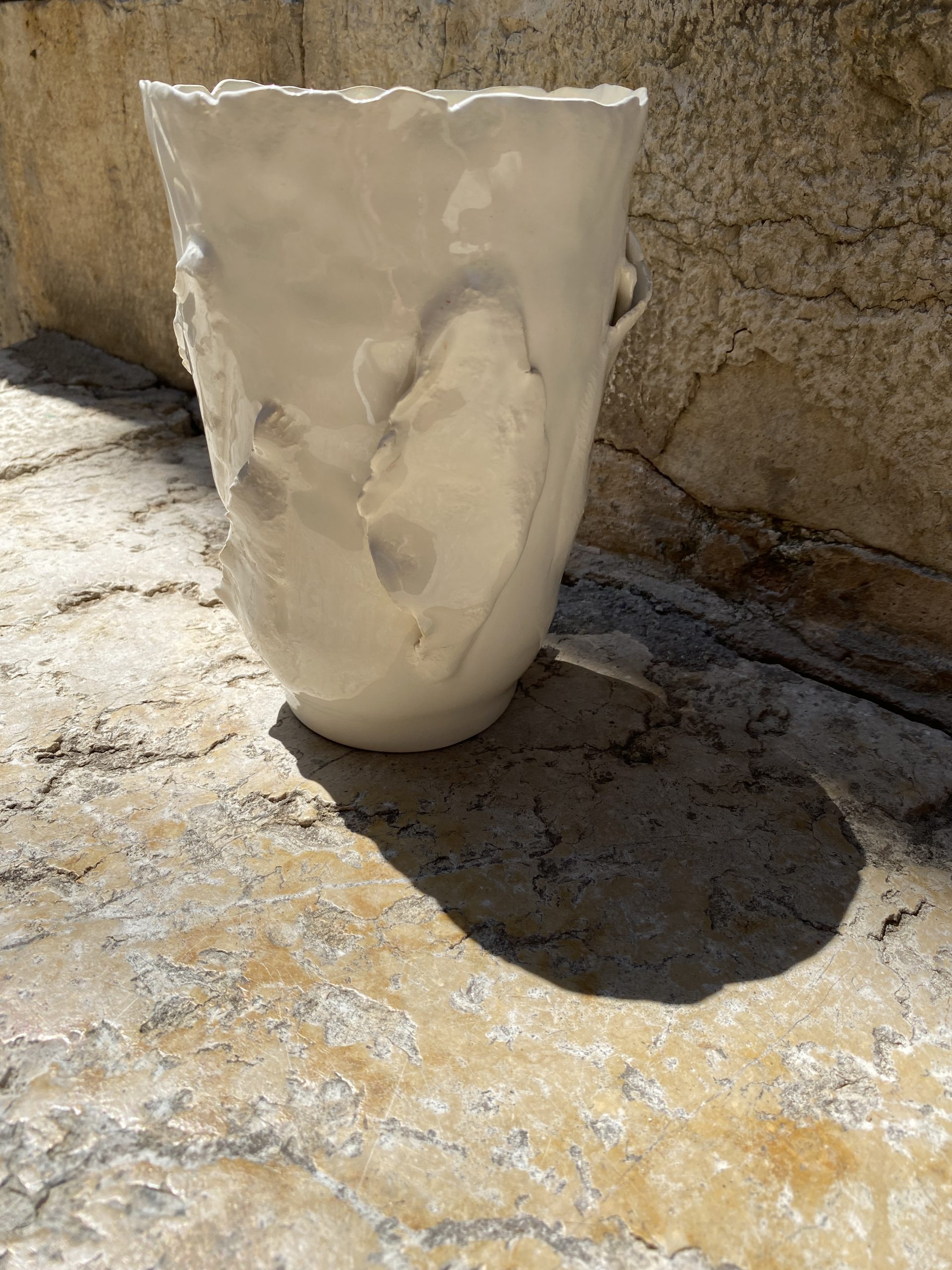 Simplicité d’un vase en faïence blanche incrusté de motifs méditerranéens.